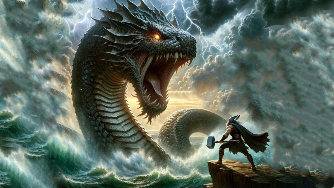 The World Serpent, so large it encircles Midgard and grasps its own tail.
